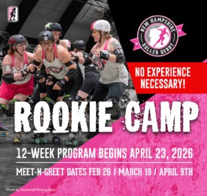 If you ever watched roller derby and thought I want to do that”; or if you are a retired skater who said “wow, I miss that”;  Starting April 23rd and running for 12 weeks,* we are excited to host our next rookie camp! Learn the ins and outs of roller derby, and train to be the next member of NH Roller Derby.